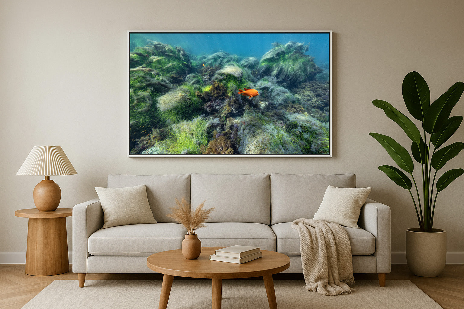 Sous la surface limpide du Pacifique, un poisson Garibaldi glisse entre les herbiers et les algues ondulantes. Sa couleur orange intense éclate littéralement au milieu d’un paysage sous-marin fait de verts, de bleus et de nuances presque textiles.