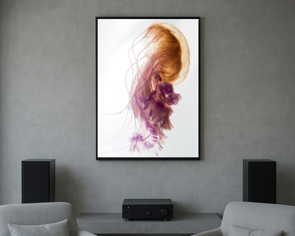 Ses teintes pourpres et ambrées se mélangent en volutes délicates, ses tentacules se déroulent comme des traits d’encre, et la finesse de ses tissus révèle une architecture organique d’une élégance rare.