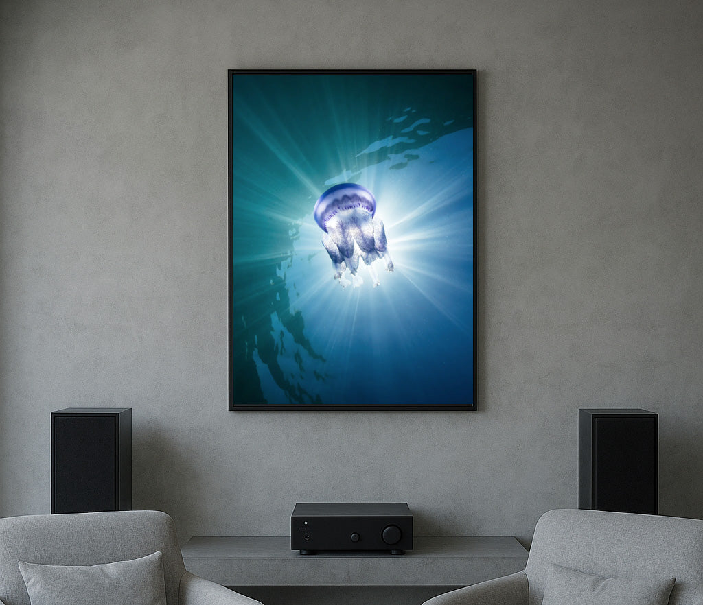 Dans la clarté turquoise des eaux méditerranéennes, une méduse s’élève lentement vers la surface où la lumière éclate en un faisceau radieux. Ses tentacules, presque cristallins, captent chaque rayon pour former une silhouette lumineuse, suspendue dans un halo bleu intense.