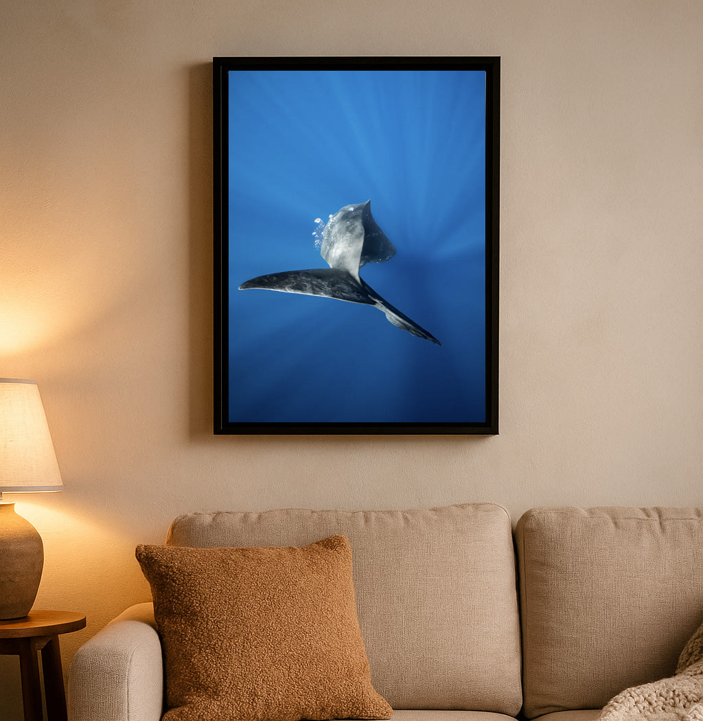 Dans un bleu profond traversé par les rayons du soleil, un jeune cachalot entame une plongée lente et élégante. Sa caudale s’élève, libérant quelques bulles qui dérivent vers la surface. L’image capture un moment suspendu, d’une pureté presque graphique, où la force et la fluidité du géant des océans se mêlent à la lumière irréelle de l’océan Indien.
